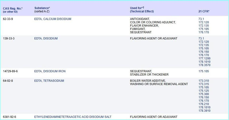 The FDA had approved the use of EDTA and its forms as food additives and categorised it Generally Recognized as Safe. Below you can see different ETDA and its uses.
