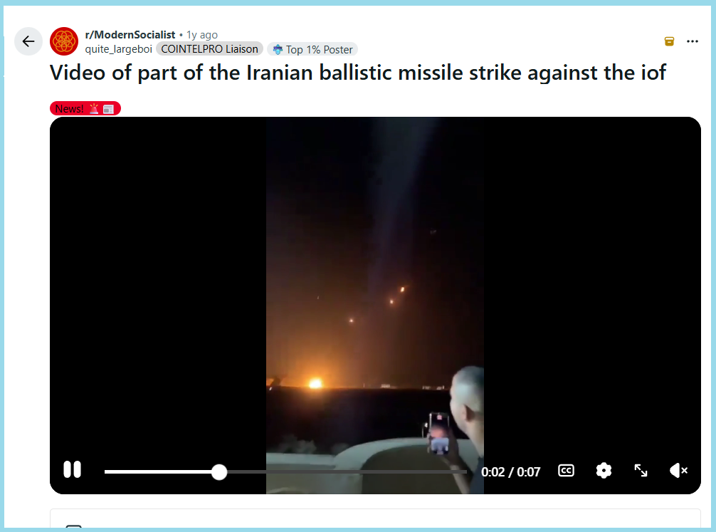We found a similar video on Reddit uploaded on 1 October 2024. According to the caption, the video shows an Iranian missile attack on Israel.