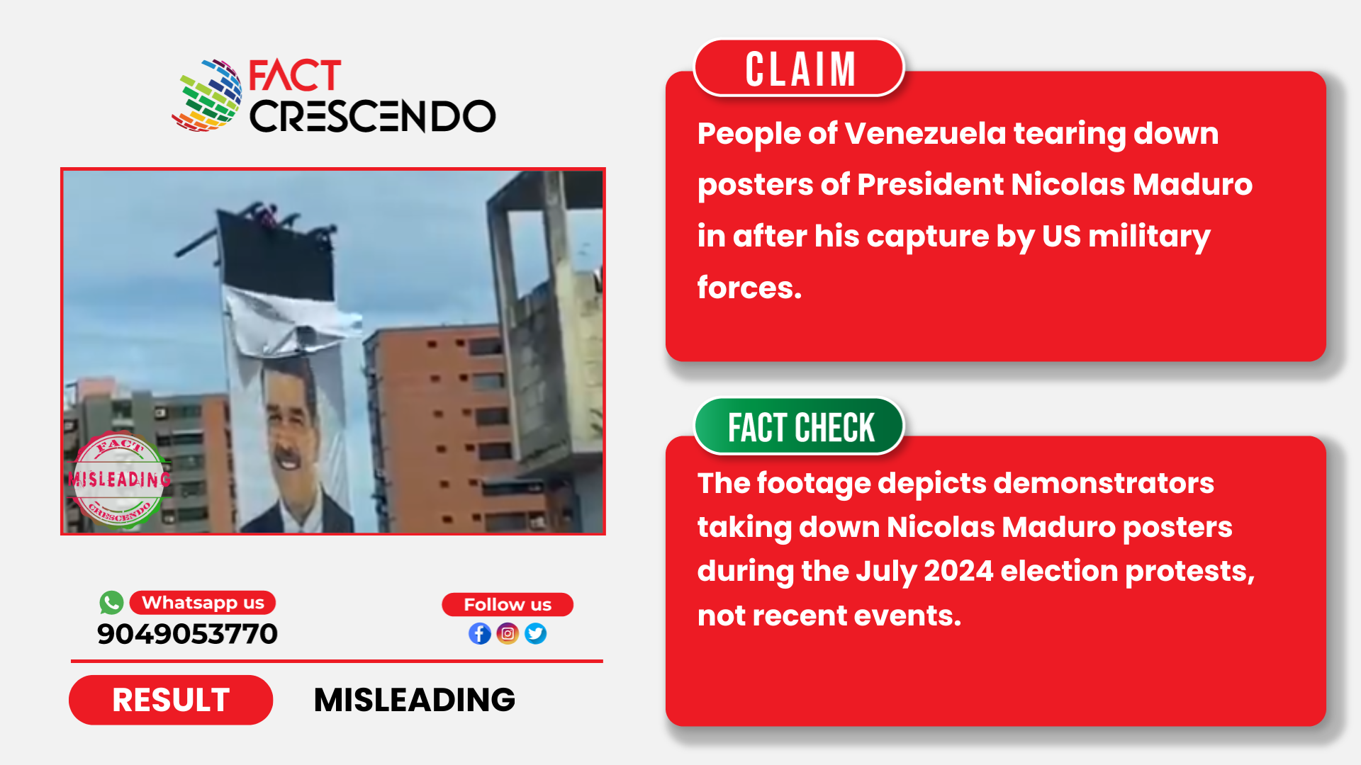 Fact Crescendo found the claim made along with the viral image to be Misleading. The footage depicts demonstrators taking down Nicolas Maduro posters during the July 2024 election protests and it is unrelated to recent unrest in Venezuela.