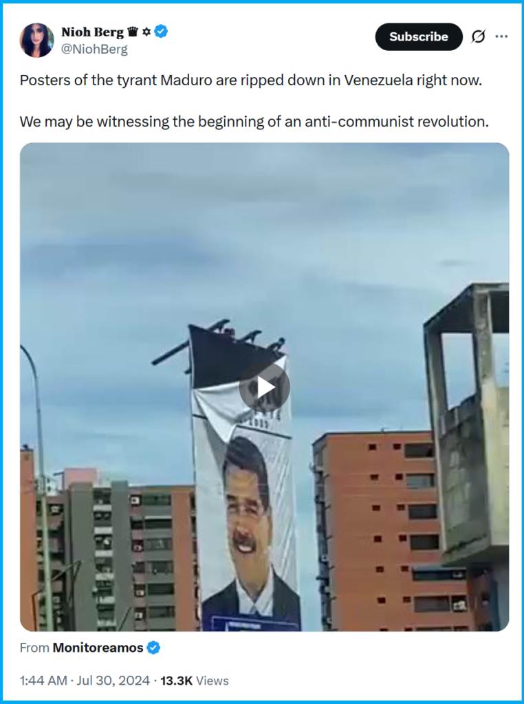 Another post from July 2024 states, “Posters of the tyrant Maduro are ripped down in Venezuela right now. We may be witnessing the beginning of an anti-communist revolution.”