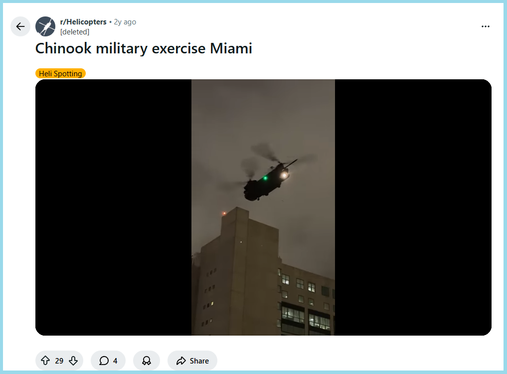 We started our investigation by taking screenshots from the viral video and conducting a reverse image search. This led us to a Reddit post where a longer version of the viral video was uploaded on 8 January 2024. According to the caption, the video shows a Chinook military exercise in Miami.