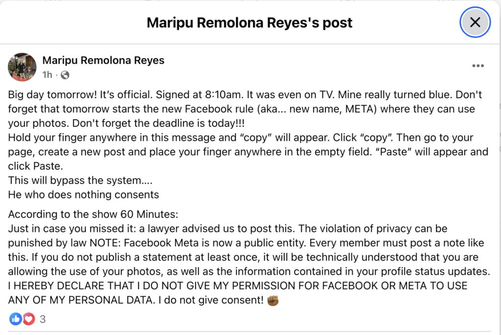 A viral Facebook message claiming users must post a disclaimer to stop Meta from using their photos is false and recycled misinformation.