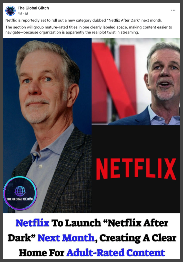 The claim has been widely shared on Facebook, Instagram, and X, asserting that Netflix is preparing to launch a new adult-only section called “Netflix After Dark.”