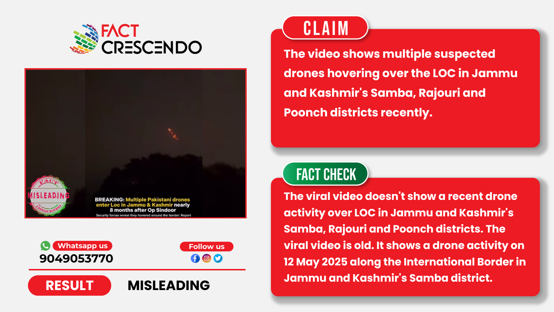 From our investigation, we can say that the claim was misleading. The viral video doesn’t show a recent drone activity over LOC in Jammu and Kashmir’s Samba, Rajouri and Poonch districts. The viral video is old. It shows a drone activity on 12 May 2025 along the international border in Jammu and Kashmir’s Samba district.