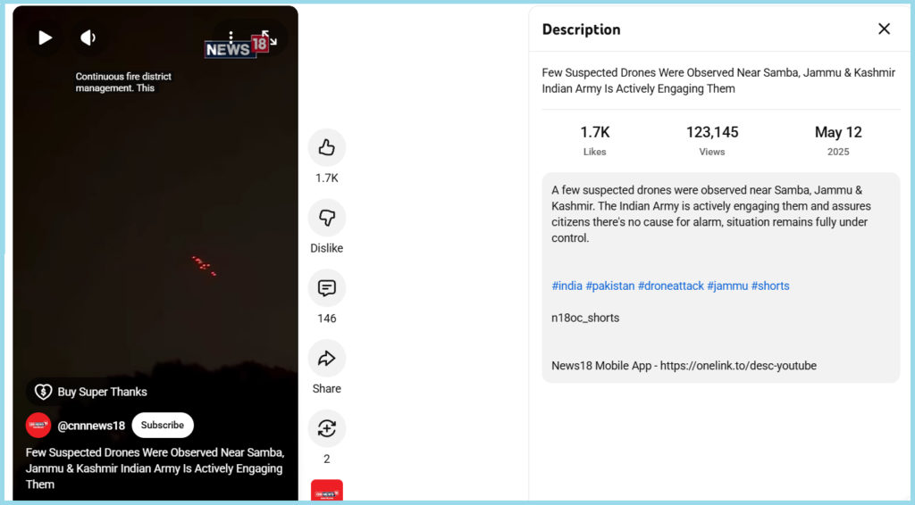 The description of the video read, “A few suspected drones were observed near Samba, Jammu & Kashmir. The Indian Army is actively engaging them and assures citizens there’s no cause for alarm, situation remains fully under control.”