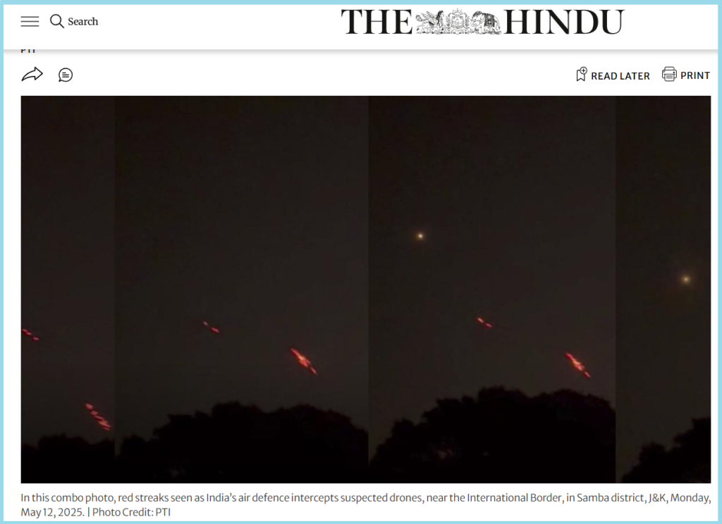 According to a report published in The Hindu on 13 May 2025, which contained a screenshot similar to the viral video, “drone activity was observed for a few hours late on Monday (May 12, 2025) along the International Border in Jammu’s Samba district as well as Punjab’s Jalandhar district”.