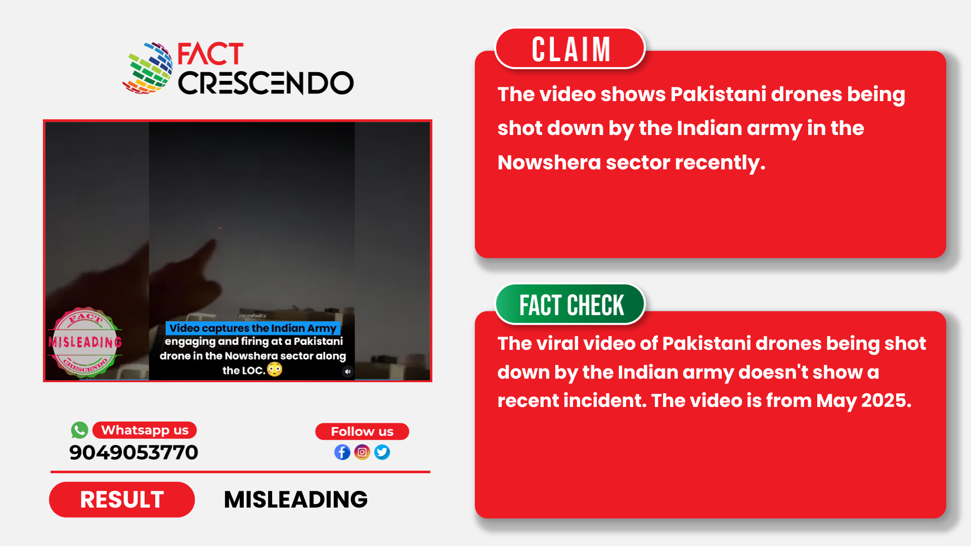 From our investigation, we can say that the claim is misleading. The viral video of Pakistani drones being shot down by the Indian army doesn’t show a recent incident. The video is from May 2025.