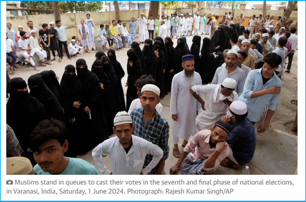We began our investigation by conducting a reverse image search on Google, which led us to a report by the Guardian published in June 2024. The report contained the same image as the viral post and was credited to Rajesh Kumar Singh/AP Photo. The caption states, “Muslims stand in queues to cast their votes in the seventh and final phase of national elections, in Varanasi, India, Saturday, June 1, 2024.