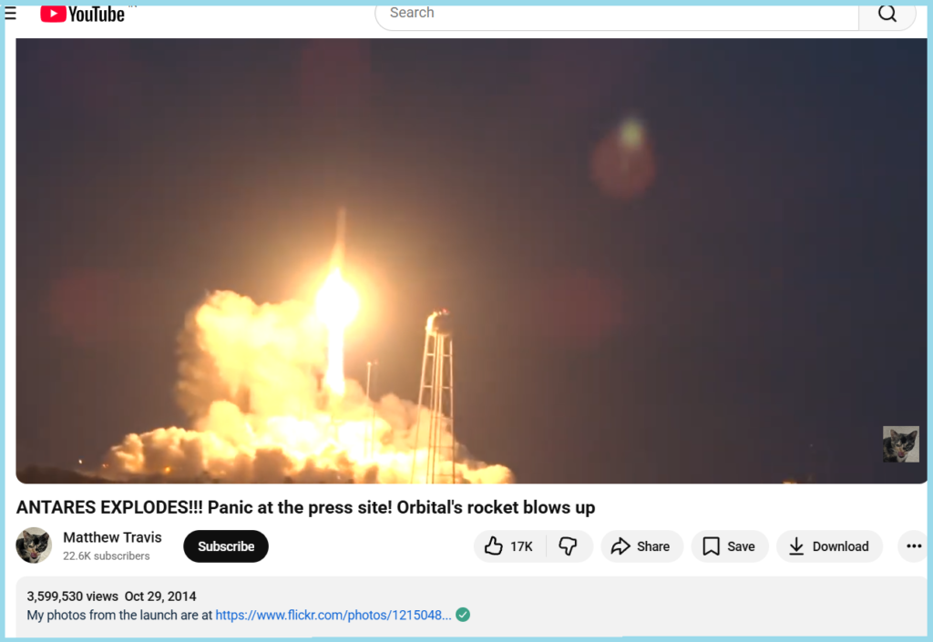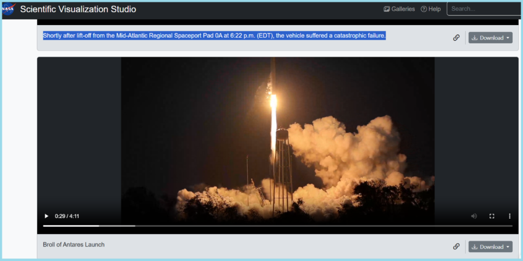 Taking this clue, we conducted a relevant keyword search. This led us to a similar video on the NASA website. The description read, “The Orbital Sciences Corporation Antares rocket, with the Cygnus spacecraft onboard suffers a catastrophic anomaly moments after launch from the Mid-Atlantic Regional Spaceport Pad 0A, Tuesday, Oct. 28, 2014, at NASA’s Wallops Flight. Shortly after lift-off from the Mid-Atlantic Regional Spaceport Pad 0A at 6:22 p.m. (EDT), the vehicle suffered a catastrophic failure.”