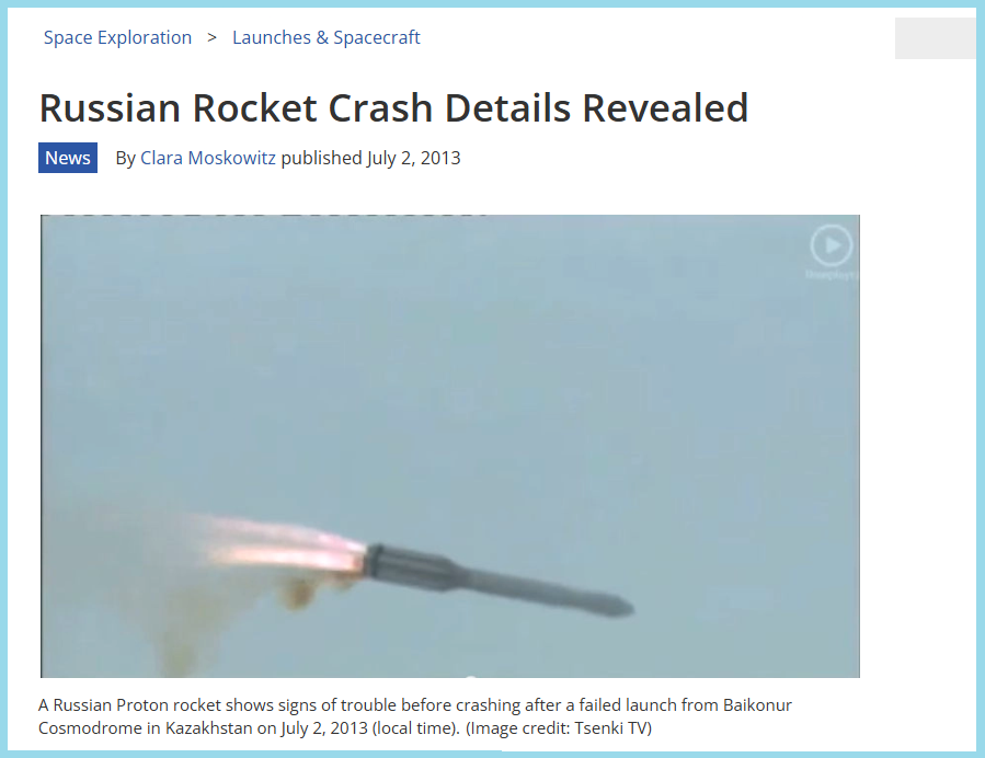 The unmanned Russian Proton-M rocket launched from the Baikonur Cosmodrome in Kazakhstanat 10:38 p.m. EDT (0238 GMT). The crash of the 17-story booster destroyed three onboard navigation satellites, which were worth almost $200 million. Video of the rocket crash from Russian state-run Rossiya-24 television shows the vehicle veering off course shortly after liftoff, and then breaking apart in mid-air and exploding in a fiery blaze once it hit the ground.