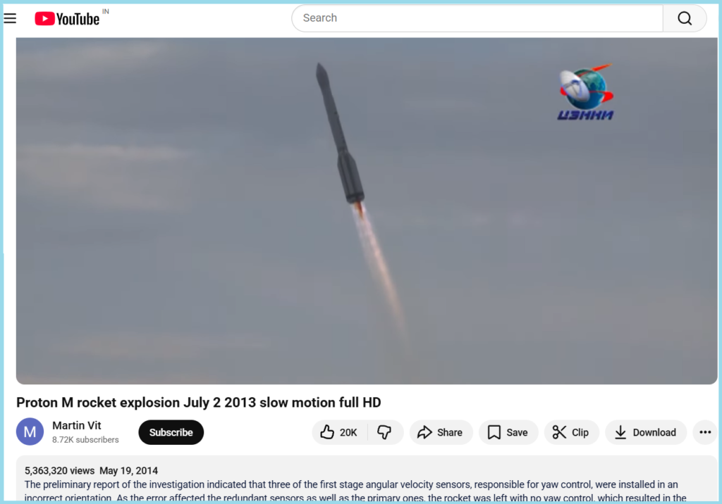 The description of the video read, “The preliminary report of the investigation indicated that three of the first stage angular velocity sensors, responsible for yaw control, were installed in an incorrect orientation. As the error affected the redundant sensors as well as the primary ones, the rocket was left with no yaw control, which resulted in the failure. Telemetry data also indicated that a pad umbilical had detached prematurely, suggesting that the Proton may have launched several tenths of a second early, before the engines reached full thrust.”