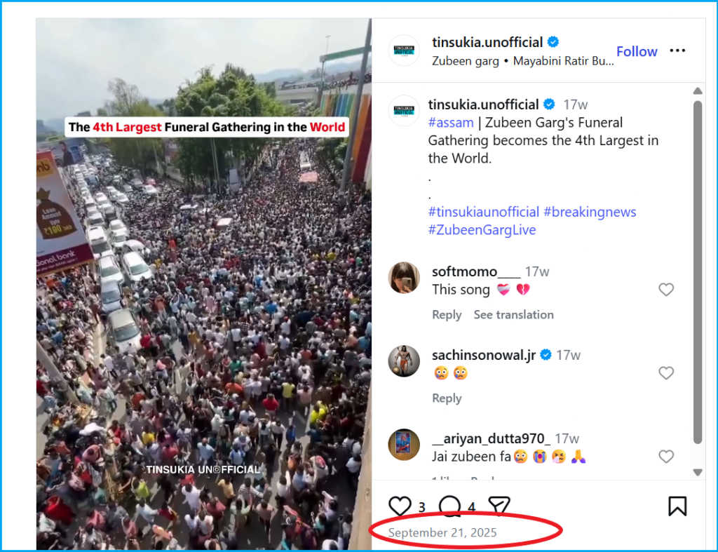 By closely analysing the video, we spotted the Punjab National Bank sign. So, we can confirm that the video is from India. We then conducted a reverse image search of the video key frames and found that the same footage uploaded on Instagram on 21 September, 2025. According to the caption, the footage is of singer Zubin Garg’s last journey in Guwahati, Assam. This indicates that the viral video shows the last journey of the renowned singer Zubeen Garg, in Guwahati, Assam.