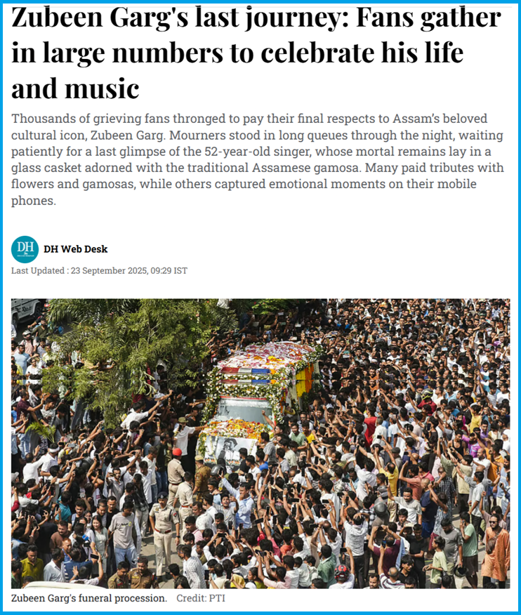 Thousands of fans gathered to pay their last respects. Fans waited in long queues throughout the night to catch a last glimpse of the singer, who was displayed in a glass coffin adorned with traditional Assamese gamosas. Many paid their respects with flowers and gamosas, while others captured the emotional moments on their mobile phones,” the report said. The streets from the airport were packed with grieving fans, who showered the slow-moving, flower-decked ambulance with petals and gamosas.