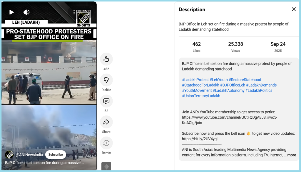 The description of the video read, “BJP Office in Leh set on fire during a massive protest by people of Ladakh demanding statehood”