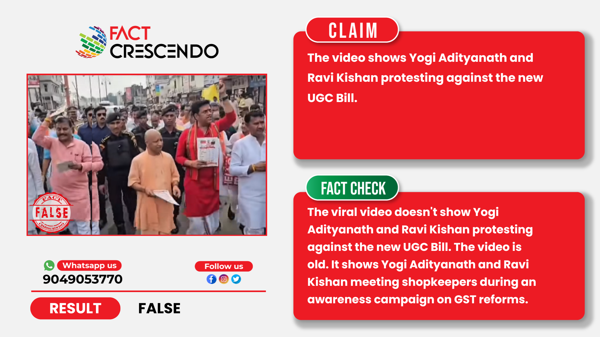 From our investigation, we can say that the claim is false. The viral video doesn’t show Yogi Adityanath and Ravi Kishan protesting against the new UGC Bill. The video is old. It shows Yogi Adityanath and Ravi Kishan meeting shopkeepers during an awareness campaign on GST reforms.