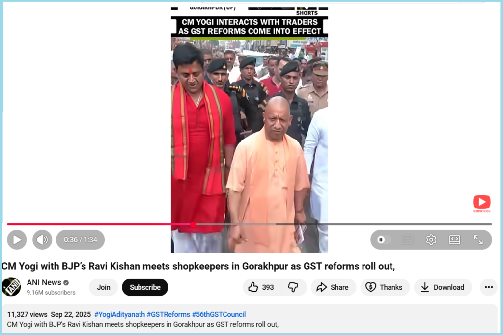 The description of the video read, “CM Yogi with BJP’s Ravi Kishan meets shopkeepers in Gorakhpur as GST reforms roll out”