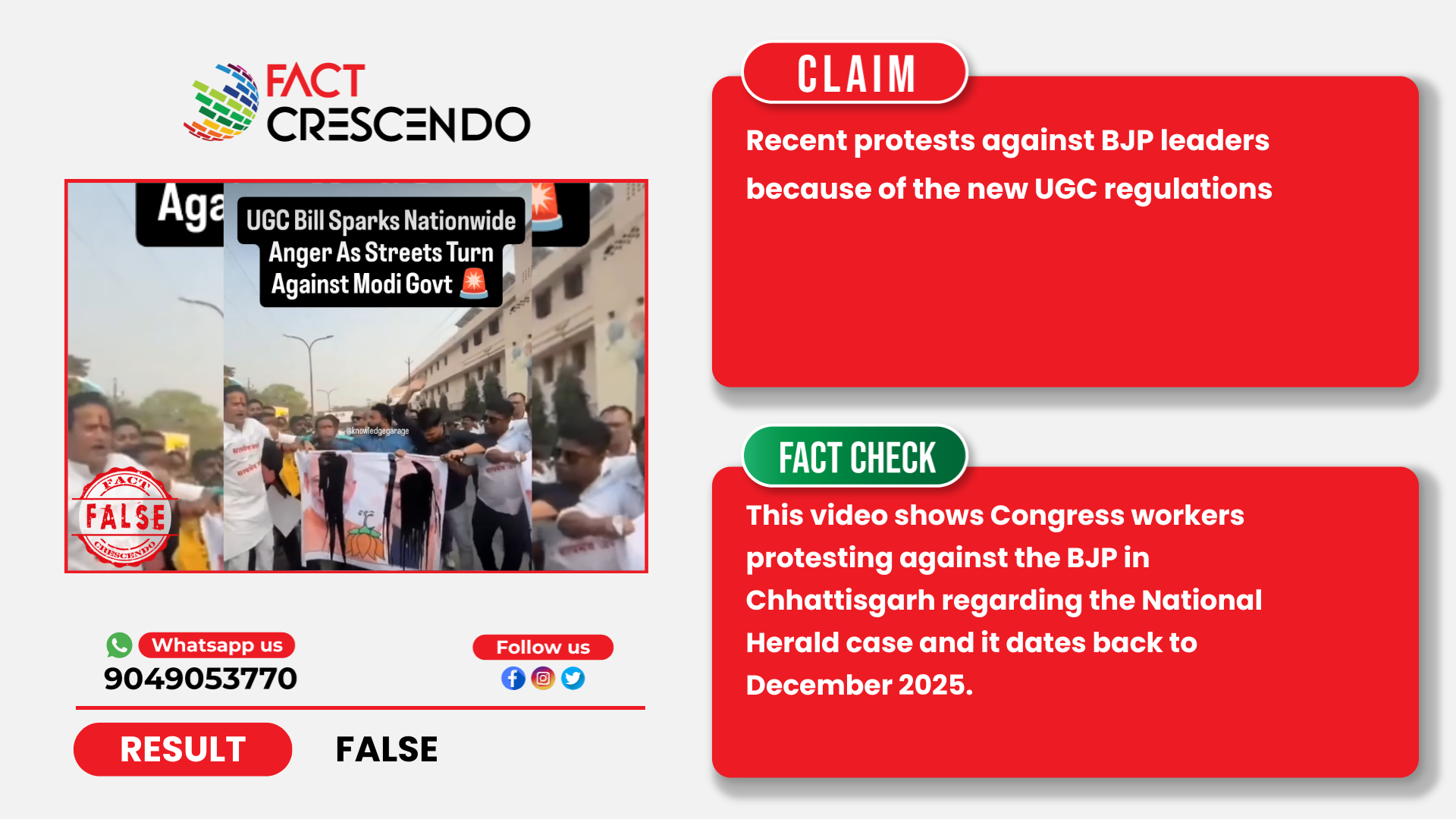 Fact Crescendo found the claim made along the viral video to be False. This video shows Congress workers protesting against the BJP in Chhattisgarh regarding the National Herald case and it dates back to December 2025.