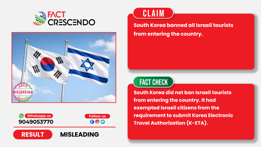 Fact Crescendo found the claim to be misleading. South Korea did not ban Israeli tourists from entering the country. It had exempted Israeli citizens from the requirement to submit Korea Electronic Travel Authorization (K-ETA).