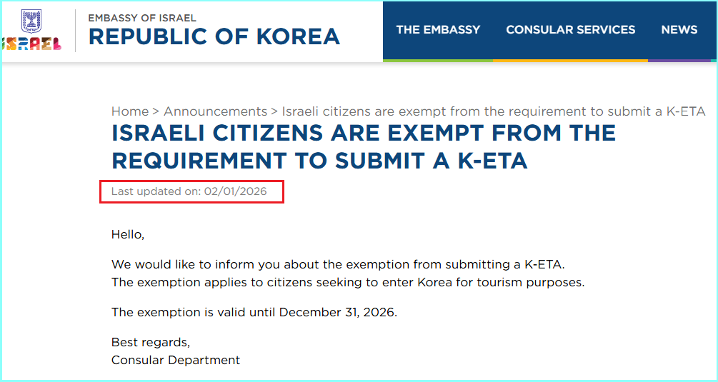 We also found information related to this on the Israel Embassy website in South Korea. In this official notice, it was clarified that Israel passport holders do not need to apply for a K-ETA if they are travelling to South Korea as tourists. The exemption is valid up to 31 December 2026.
