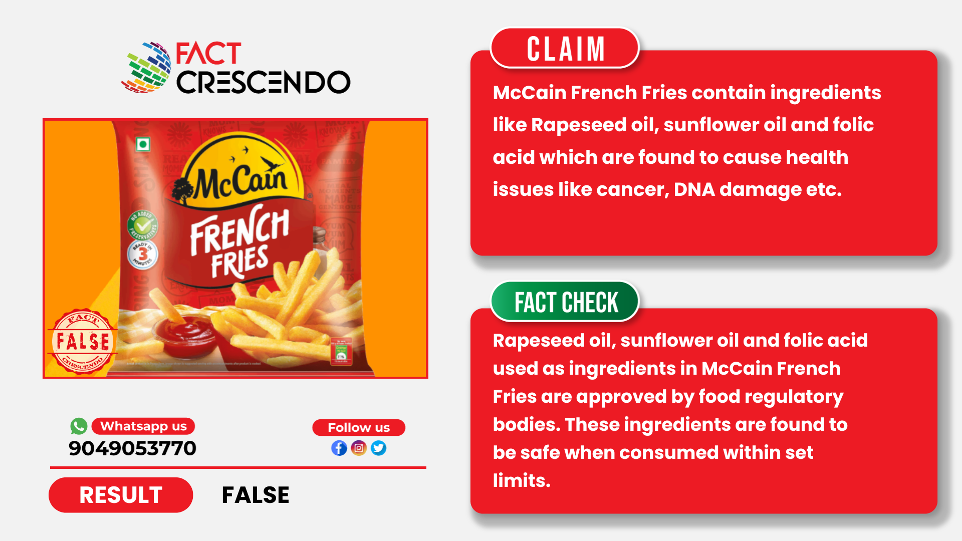 However, Fact Crescendo found that ingredients in McCain French fries are safe and have been approved by food safety regulatory bodies. The mentioned ingredients are safe when consumed within the prescribed limits.