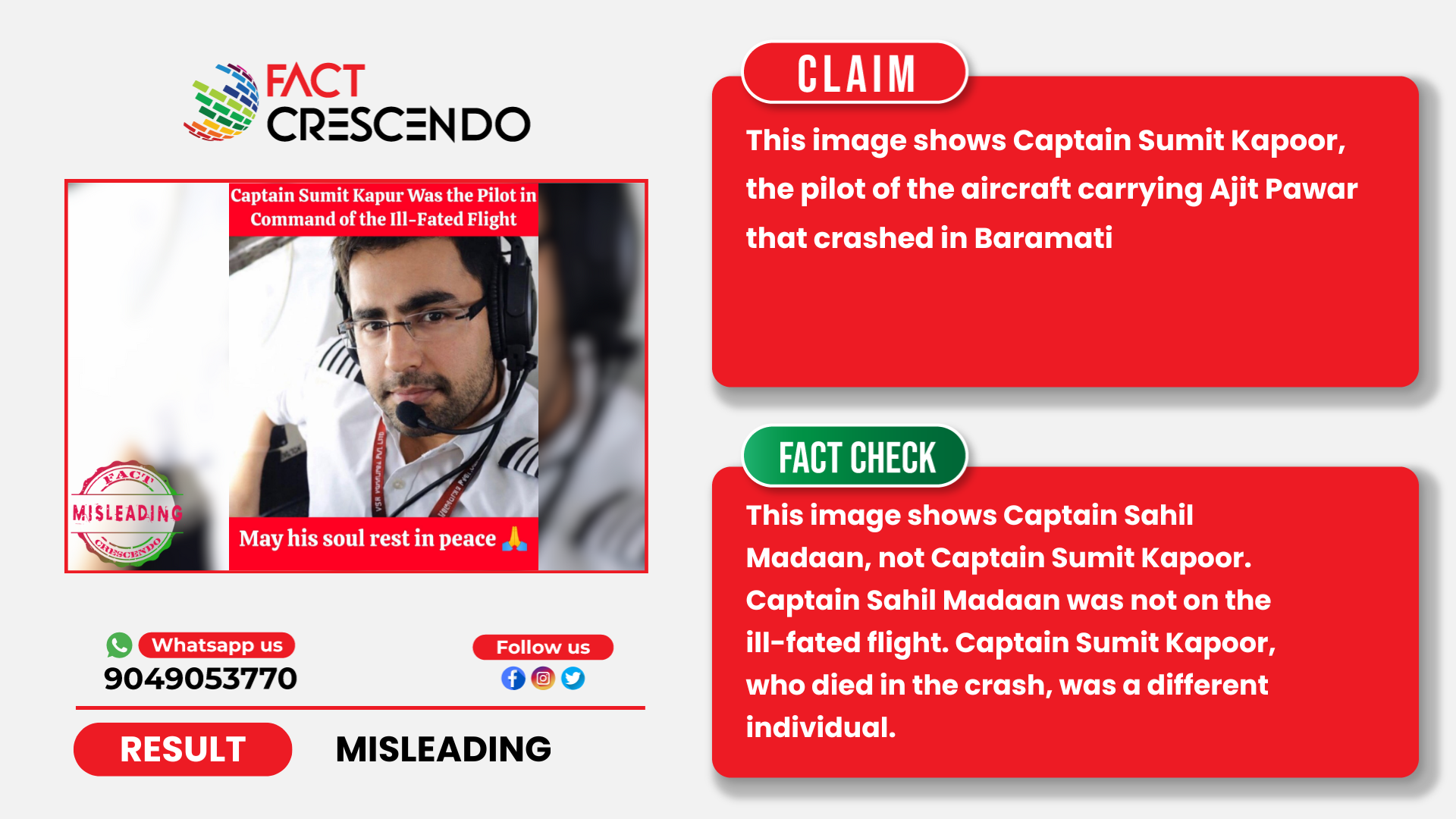 Fact Crescendo found the claim made along with the viral image to be Misleading. This image shows Captain Sahil Madaan, not Captain Sumit Kapoor. Captain Sahil Madaan was not on the ill-fated flight. Captain Sumit Kapoor, who died in the crash, was a different individual.