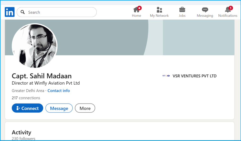 So, we conducted a reverse image search of the viral image and the results led us to Captain Sahil Madaan, who is an experienced commercial pilot with over 16 years of aviation experience, primarily specializing in business jets and turboprop aircraft. According to his LinkedIn profile, Sahil began his aviation journey in 2010 with Air Charter Services Pvt. Ltd as Captain flying Pilatus PC-12 for over five years. He joined VSR Ventures Pvt. Ltd in 2015, and after working for four years, he moved to Winfly Aviation Pvt Ltd as a full-time chief pilot.