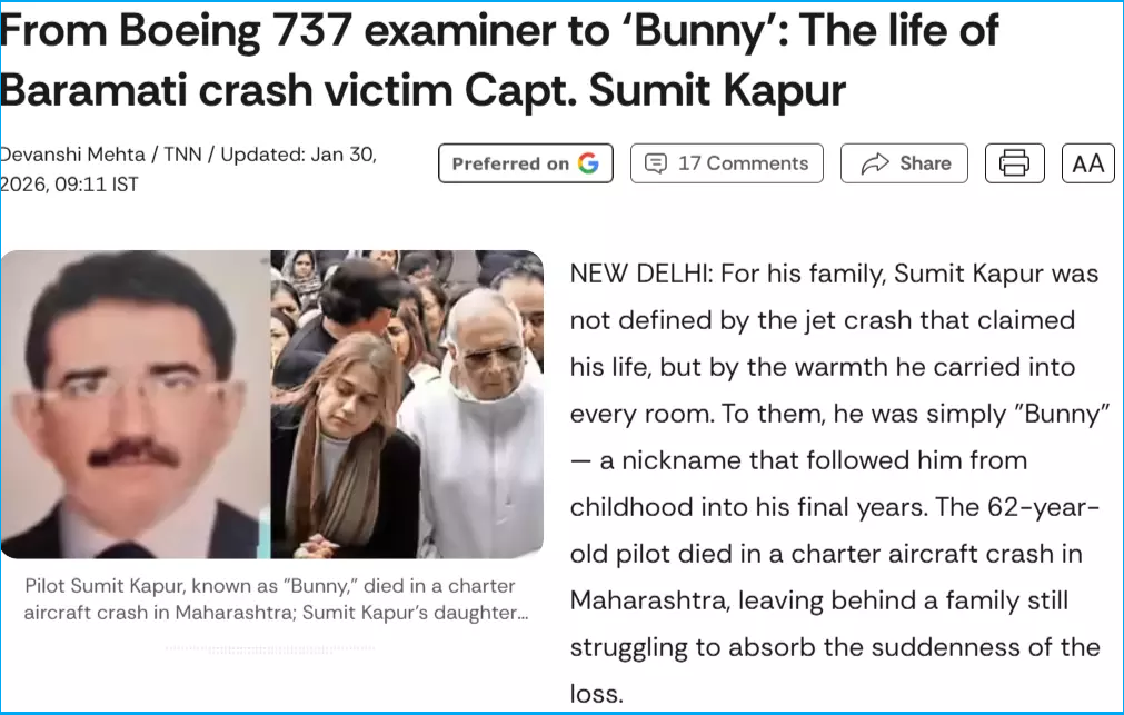 We started our investigation with a keyword search for Captain Sumit Kapur which led us to several news reports. As per reports, the Pilot in-command, Captain Sumit Kapur, and First Officer, Shambhavi Pathak were experienced professionals with over 15,000 hours of flying under their belt. Their identities were confirmed by the aircraft operator, VSR Aviation.