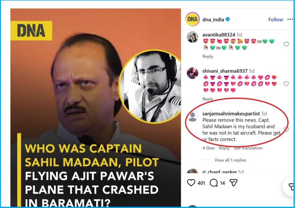 Apart from this, we also found a comment on the Instagram post of news outlet DNA from the handle @sanjamsahnimakeupartist , in which the user, identifying herself as the wife of pilot Sahil Madan, clarified that her husband was not on that plane.