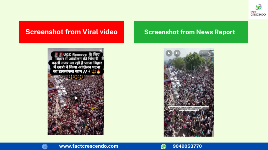From our investigation, we can say that the claim is false. The viral video doesn’t show a protest in Patna against the new UGC Bill. The video shows renowned singer Zubeen Garg’s last journey from the Guwahati airport to his home in Kahilipara, Guwahati.