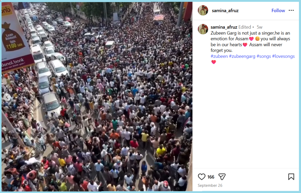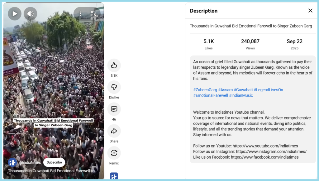 The description of the video read, “An ocean of grief filled Guwahati as thousands gathered to pay their last respects to legendary singer Zubeen Garg. Known as the voice of Assam and beyond, his melodies will forever echo in the hearts of his fans.”