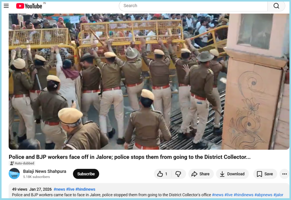 The caption of the video read, “Police and BJP workers face off in Jalore; police stops them from going to the District Collector…”