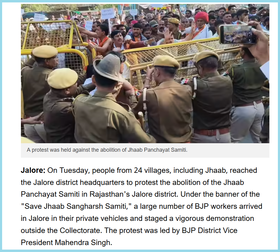 The translation of the report read, “On Tuesday, people from 24 villages, including Jhaab, reached the Jalore district headquarters to protest the abolition of the Jhaab Panchayat Samiti in Rajasthan’s Jalore district. Under the banner of the “Save Jhaab Sangharsh Samiti,” a large number of BJP workers arrived in Jalore in their private vehicles and staged a vigorous demonstration outside the Collectorate. The protest was led by BJP District Vice President Mahendra Singh.