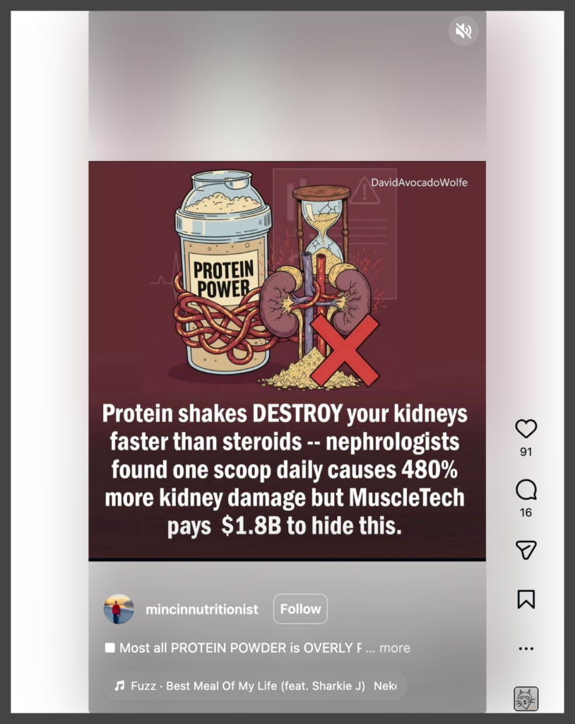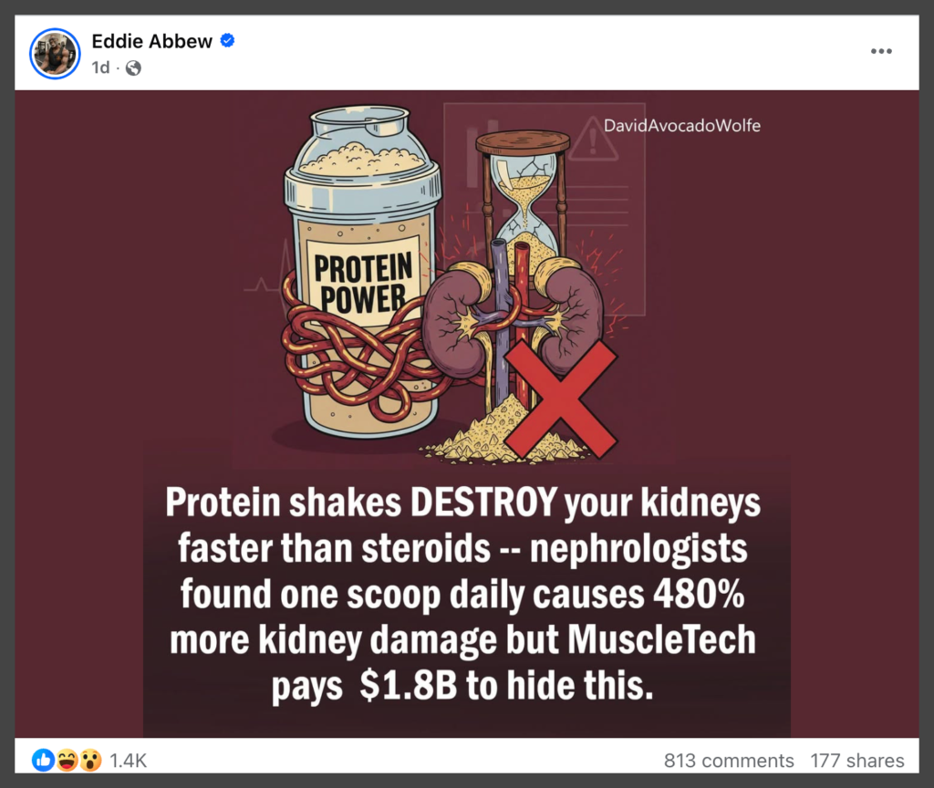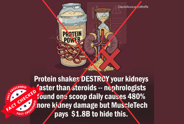 Social media posts circulating on platforms claim that protein shakes destroy kidneys faster than anabolic steroids, that nephrologists found one scoop a day causes “480% more kidney damage,” and that MuscleTech allegedly paid $1.8 billion to suppress this information. Upon our investigation, we found that the claim is false based on available evidence.
