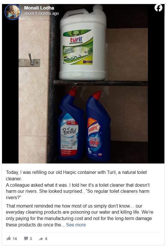 A social media post describes replacing an old Harpic bottle with Turil, a “natural” toilet cleaner, and raises concerns about whether regular toilet cleaners pollute rivers and harm human health. The post claims that widely used products such as toilet cleaners, detergents, and dishwashing liquids contain toxic chemicals that damage aquatic ecosystems and are linked to health problems, while promoting “natural” alternatives as safer.