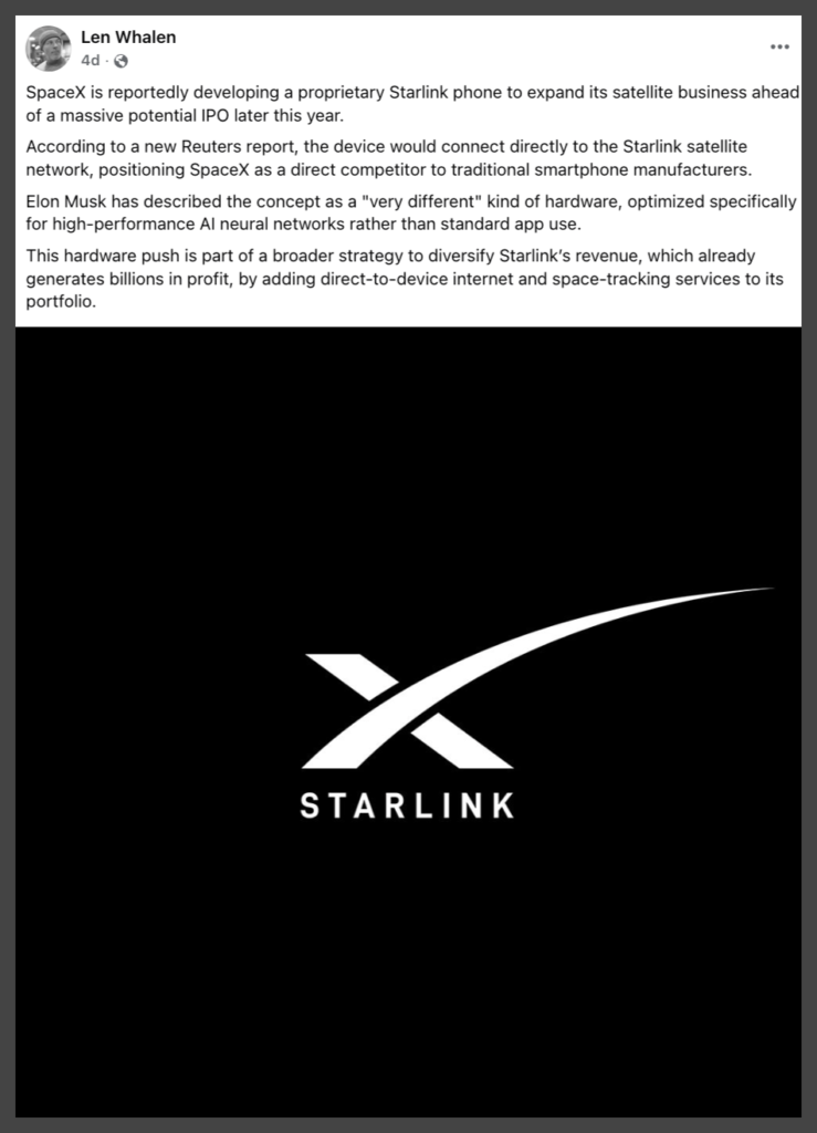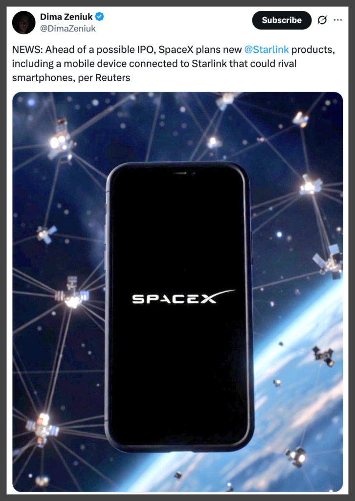 A claim circulating widely on social media and repeated in tech and business news discussions states that, ahead of a possible IPO, SpaceX plans new Starlink products, including a mobile device connected to Starlink that could rival smartphones. The claim is largely traced to reporting by Reuters, which cited unnamed sources describing internal discussions and potential product exploration. However, available evidence shows that this interpretation overstates what has been confirmed publicly.
