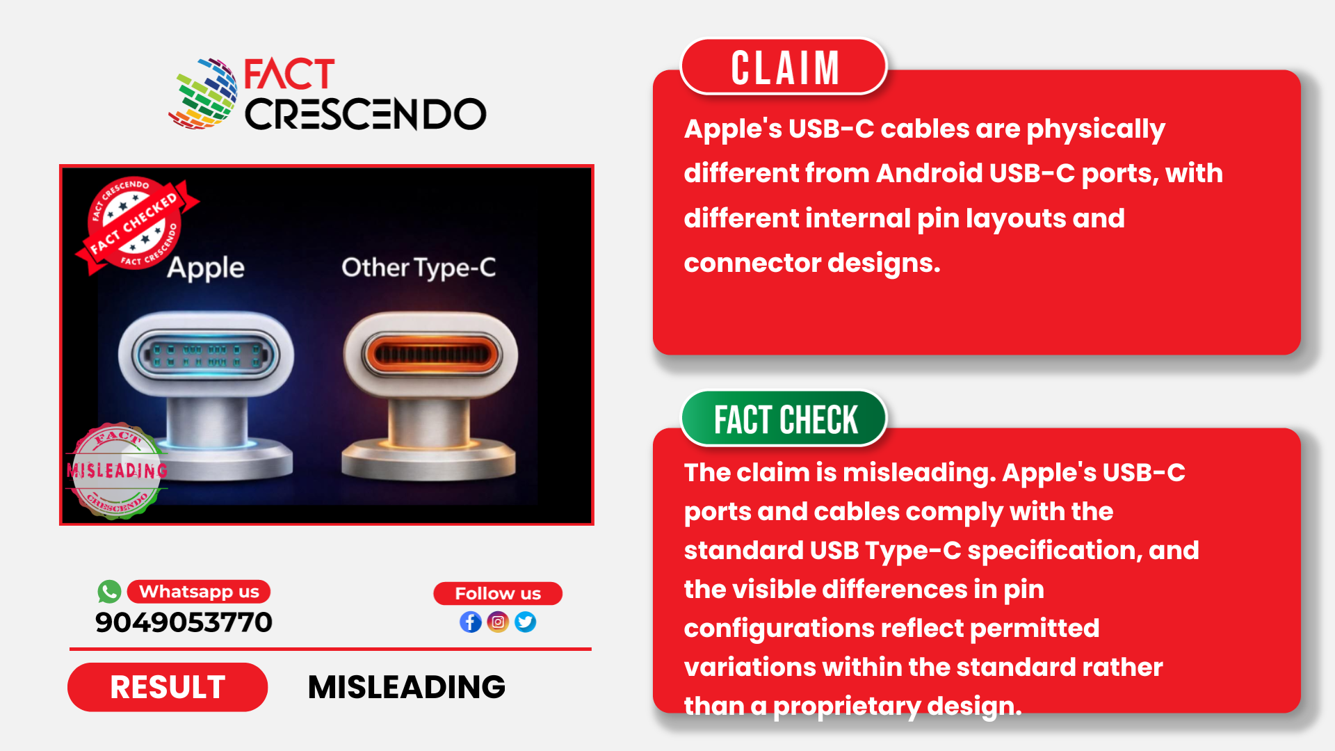 A claim circulating widely on social media platforms states that Apple’s USB-C (Type-C) connectors or cables are physically different from “normal” or Android USB-C cables. These posts often suggest that Apple uses a proprietary or incompatible USB-C design. However, our review shows that this claim is misleading.