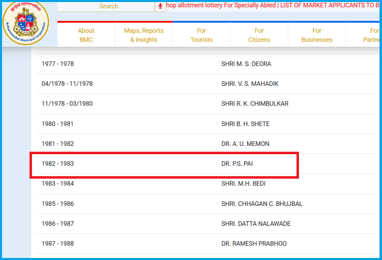 BMC was earlier known as the Municipal Corporation of Greater Mumbai (MCGB). It was renamed as Brihanmumbai Municipal Corporation (BMC) on Maharashtra Day 2022. The list of former mayors is given on the official website of BMC . In this, Dr. P.S. Pai’s name is given as the 53rd mayor during the period 1982-1983.