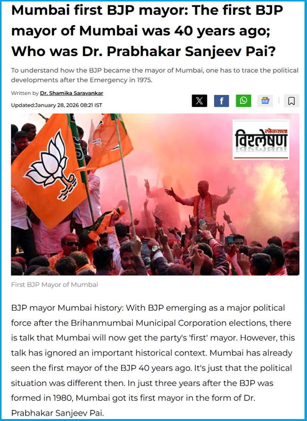 When we searched for information about the first BJP mayor of the Brihanmumbai Municipal Corporation (BMC), we found several reports. One report by Loksatta, dated 26 January, 2026, shortly after the results of the local body elections in Maharashtra were announced, indicated that Dr. Prabhakar Sanjeev Pai was the first BJP mayor of Mumbai.