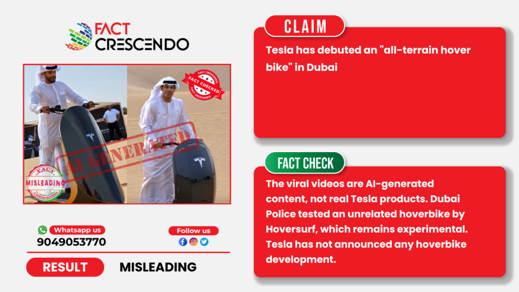 Posts promoting the claim typically feature images or video clips of a flying motorcycle device, often accompanied by captions such as “Tesla’s all-terrain hover bike unveiled in Dubai” or “Tesla redefines urban mobility with futuristic hoverbike.”