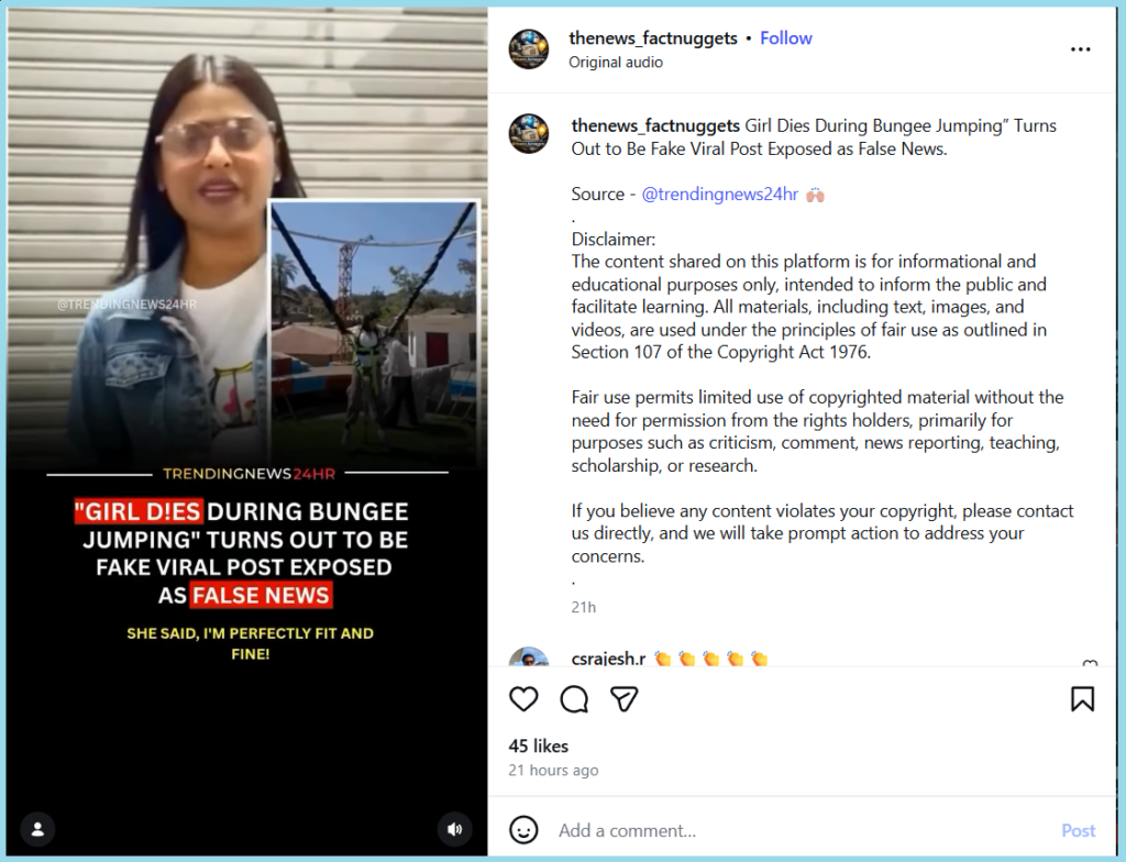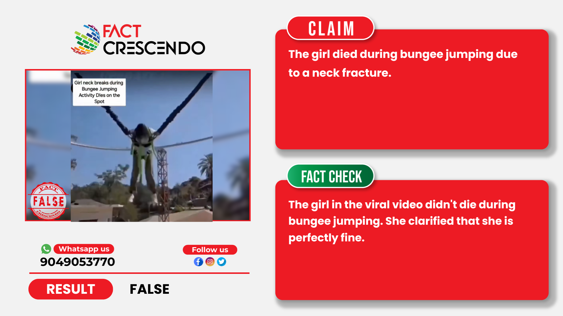 From our investigation, we can say that the claim is false. The girl in the viral video didn’t die during bungee jumping. She clarified that she is perfectly fine.
