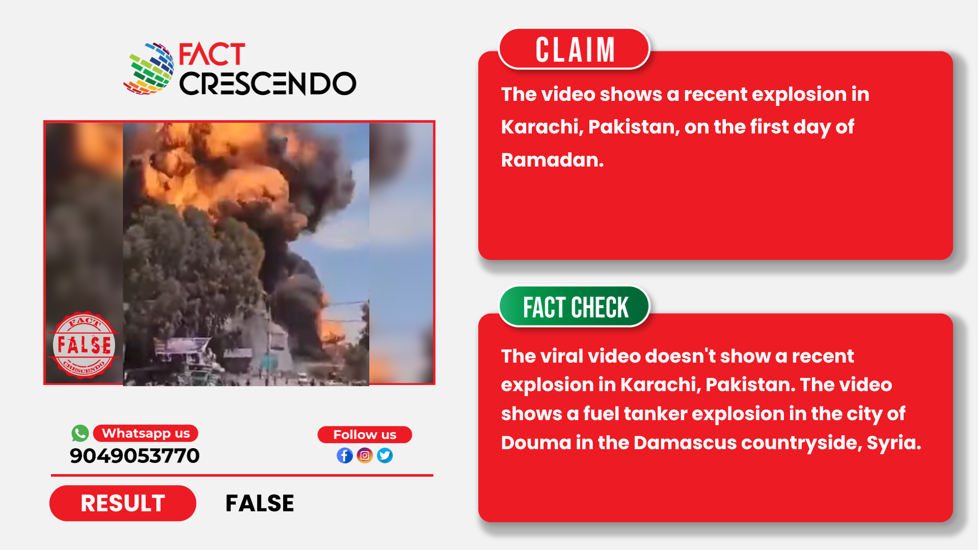 From our investigation, we can say that the claim is false. The viral video doesn’t show a recent explosion in Karachi, Pakistan. The video shows a fuel tanker explosion in the city of Douma in the Damascus countryside, Syria.