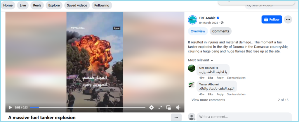 The translation of the caption read, “It resulted in injuries and material damage… The moment a fuel tanker exploded in the city of Douma in the Damascus countryside, causing a huge bang and huge flames that rose up at the site.”