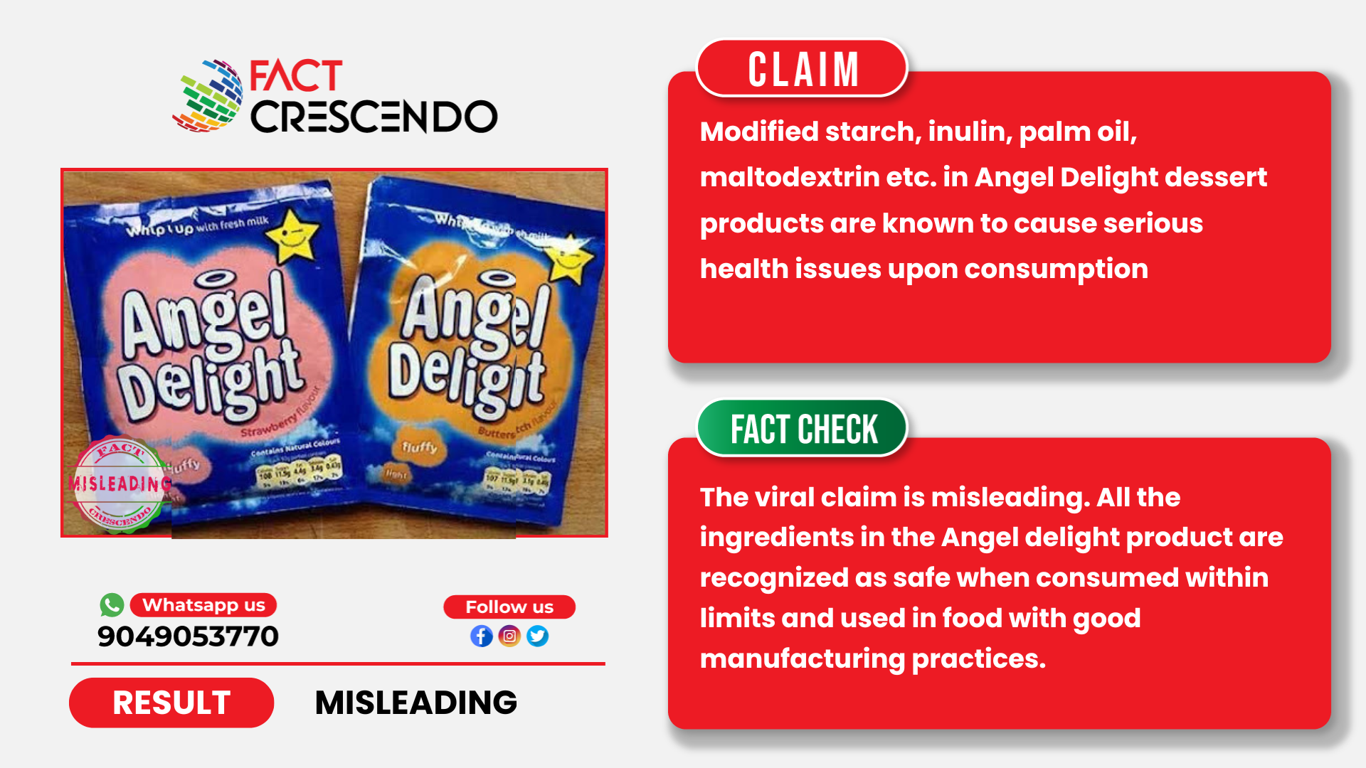 Fact Crescendo found the claim to be misleading. All the ingredients in the Angel delight product are recognized as safe when consumed within limits and used in food with good manufacturing practices.