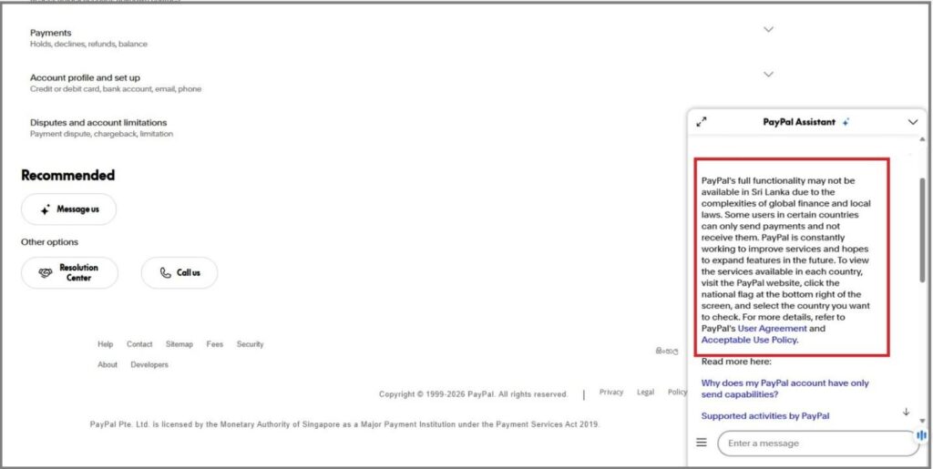 PayPal’s own support documentation notes that full functionality may be limited in Sri Lanka due to the complexities of local finance laws. While users can send money abroad, Sri Lankan law currently prevents the transfer of funds from other countries into local accounts via the platform.