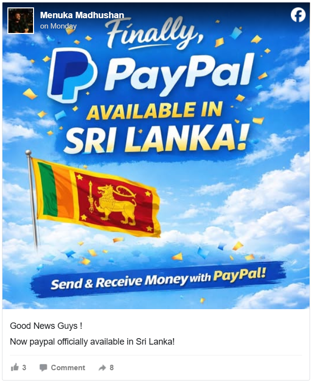Some social media posts indicated that “PayPal had finally arrived in Sri Lanka”, indicating that the ability to receive money through PayPal was made available recently.
