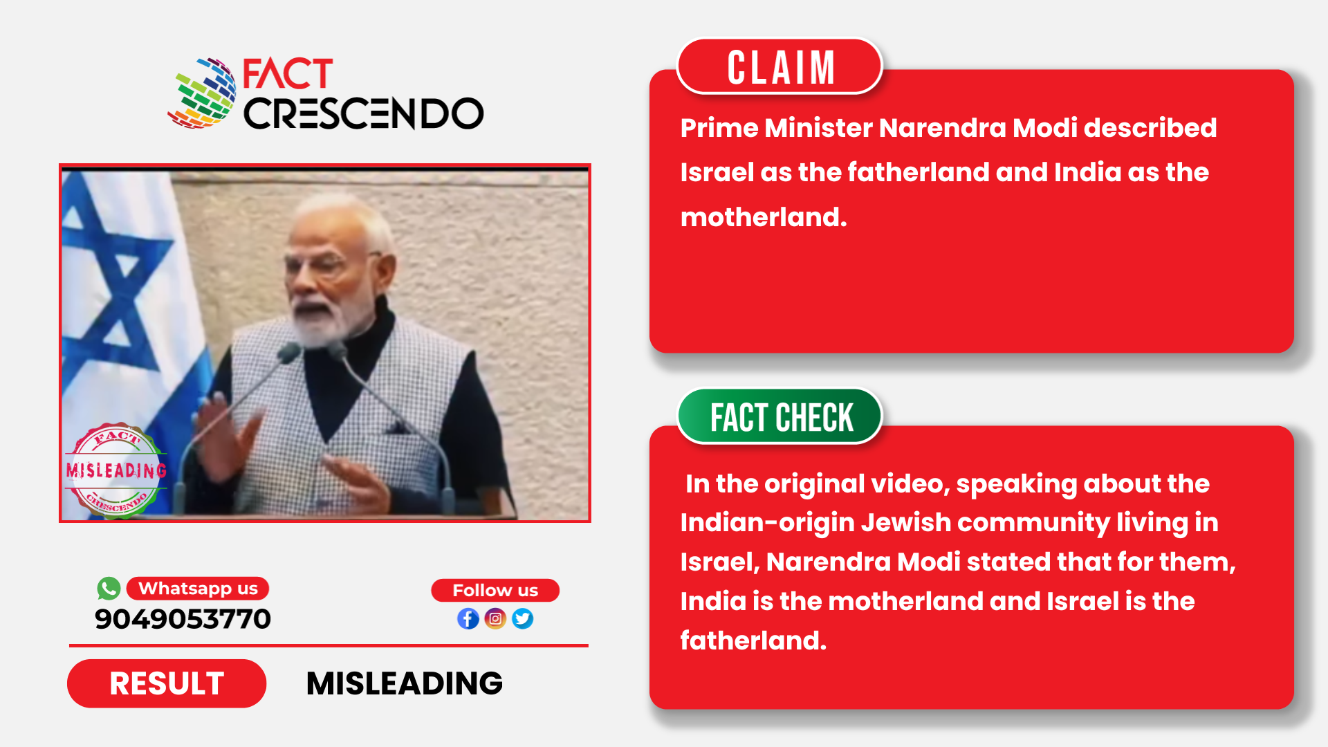 From our investigation, we can say that the claim is misleading. In the original video, speaking about the Indian-origin Jewish community living in Israel, Narendra Modi stated that for them, India is the motherland and Israel is the fatherland.