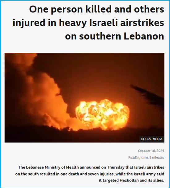 Using these hints, we conducted further searches and found a report by BBC News, published on 16 October, 2025. It stated that the Lebanese Ministry of Health announced Israeli airstrikes on the south resulted in one death and seven injuries, while the Israeli army said it targeted Hezbollah and its allies. “Lebanese President Joseph Aoun confirmed that the Israeli raids targeted “civilian facilities,” condemning what he described as a violation of last year’s ceasefire agreement. Aoun said that the repeated Israeli aggression “comes within a systematic policy aimed at destroying productive structures, hindering economic recovery, and targeting national stability under false security pretexts,” as he put it,” read the post’s caption.
