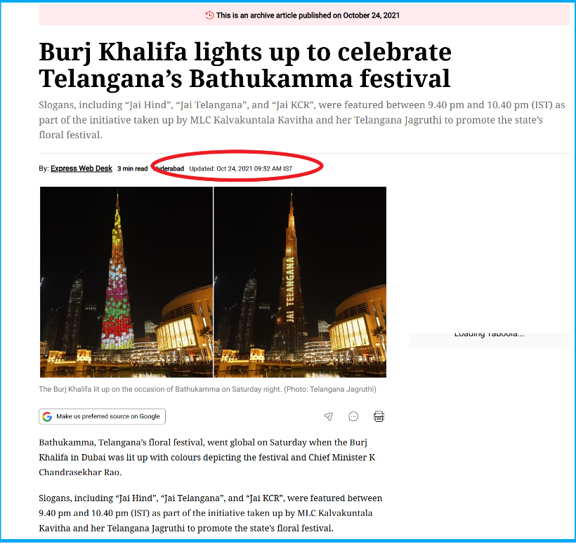 Moving forward, we found several news reports regarding this. The Indian Express report stated that, “Bathukamma, Telangana’s floral festival, went global on Saturday when the Burj Khalifa in Dubai was lit up with colours depicting the festival and Chief Minister K Chandrasekhar Rao.