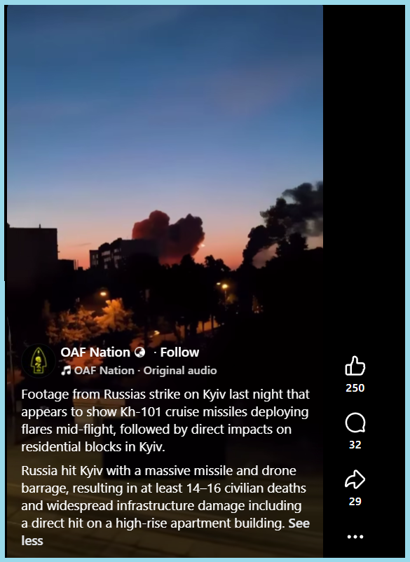 We started our investigation by taking screenshots from the viral video and conducting a reverse image search. This led us to a Facebook page where the viral video was uploaded on June 18, 2025. According to the post, the video shows the Russian airstrike on Kyiv, Ukraine on June 17, 2025.