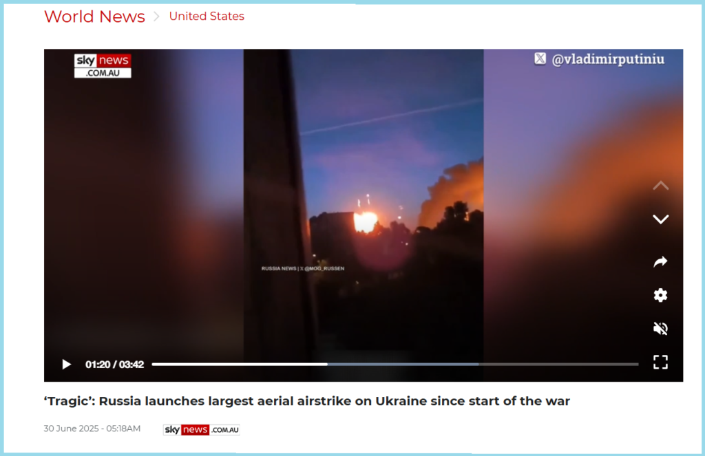 Moving forward, we found a report published on Sky News Australia on June 30, 2025. The report was on the Russian airstrikes on Ukraine in June 2025. Amongst the other clips, we found the viral video in this report.